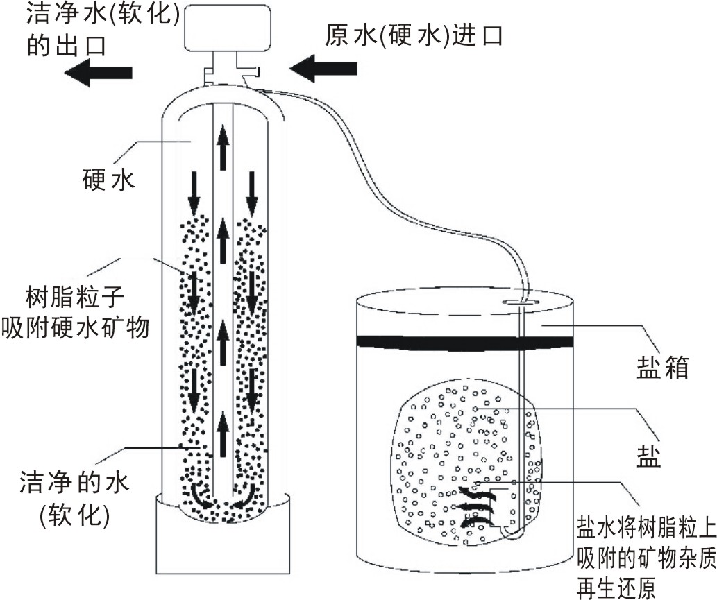 軟水器又稱鈉離子交換器,通過樹脂吸附水中的鈣鎂離子,由于水的硬度主要由鈣、鎂形成及表示,故一般采用陽離子交換樹脂將水中的 Ca2+、Mg2+置換出來,隨著溯旨內(nèi)Ca2+、Mg2+的增加,樹脂去除Ca2+、Mg2+的效能逐漸降低。當(dāng)樹脂吸收一定量的鈣鎂離子之后,就必須進(jìn)行再生,再生過程就是用鹽箱中的鹽水沖洗樹脂層,把樹脂上的硬度離子再置換出來,隨再生廢液排出罐外,樹脂就又恢復(fù)了軟化交換功能。鈉離子交換軟化處理的原理是將原水通過鈉型陽離子交換樹脂,使水中的硬度成分Ca2+、Mg2+與樹脂中的Na2+相交換,從而吸附水中的Ca2+、Mg2+使水得到軟化。